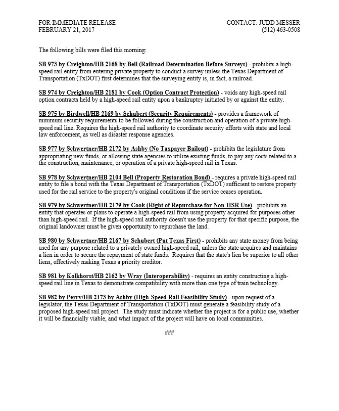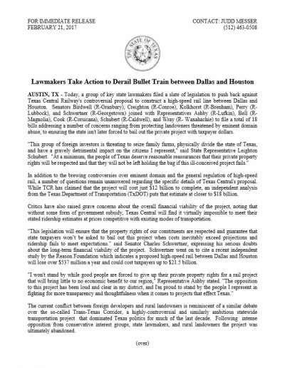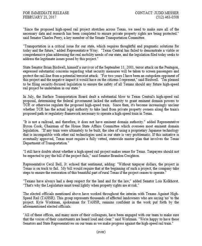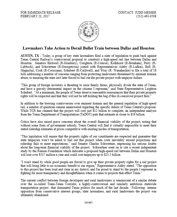 Judge Ben Leman, Chairman of Texans Against High-Speed Rail, said, “The decision to withdraw these court cases is a clear indicator that Texas Central understands they will not get a ruling in one of these cases designating them as a railroad with eminent domain authority. This, in conjunction with the permit requirement from county governments, forces them to go to the state legislature for a legislative fix. We will see them at the Capitol.”