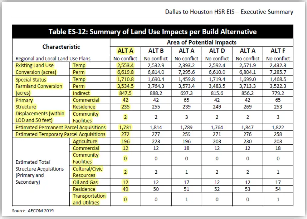 Third, Texas Central’s supposed environmental benefits are misleadingly as they are based on comparisons of a completely full high-speed rail line and a Boeing 777. However, the airplanes that fly between Dallas and Houston are much smaller Boeing 737’s, McDonnell Douglas MD 80 series-planes, Airbus A319 and A320 aircraft, or 50-75 seat regional jets. All of these aircraft emit significantly less carbon dioxide than a Boeing 777. Moreover, Japanese trains operate with much higher passenger loads than the average Texas Central train is projected to carry. And, importantly, Texas Central has no real possibility of running its trains anywhere near capacity, which would negate any potential environmental benefit. Texas Central has provided no data to suggest that true environmental savings will take place, while all available data strongly suggests just the opposite.