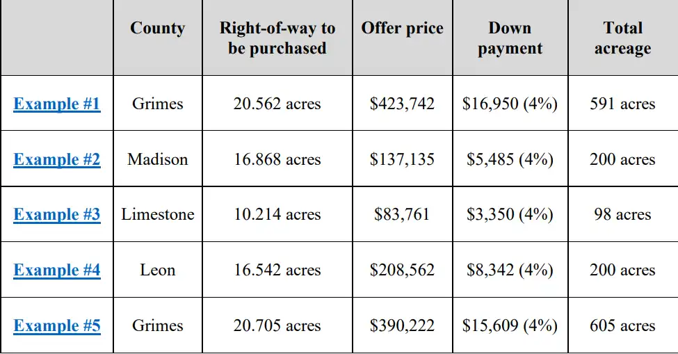 Texas Central has what it calls an Option Purchase Program. Essentially, Texas Central offered to purchase all or a portion of certain landowners’ property along the route. In exchange for a 4% down payment of the total purchase price, Texas Central would retain right to exercise its option to purchase the property until a date certain (most of the options expired on December 31, 2018 or 2019). In many instances, the property to be purchased encompassed just a sliver of the landowner’s entire property. Texas Central offered over market value for this sliver, and agreed to pay the 4% down payment shortly after execution of the option. According to many landowners,