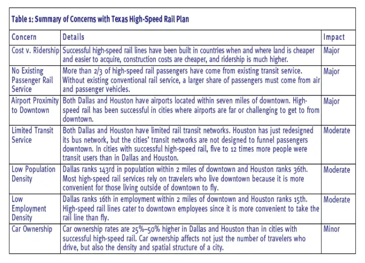 More from Reason: “Dallas and Houston are poster children for big cities where high-speed rail has no chance of succeeding without public funding unless land use and transit patterns change dramatically.” Reason concluded the project “will fail so spectacularly that privately financed U.S. high-speed rail lines may never be given a second chance.”